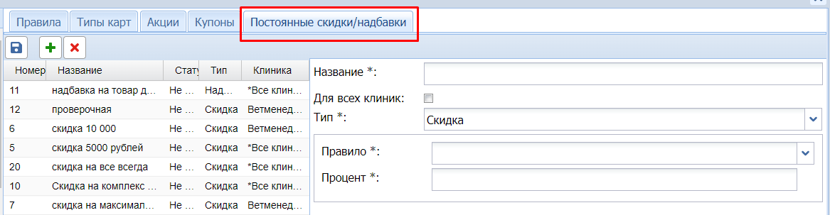 • для всех клиник (если поставить галочку здесь, скидка/надбавка будет распространяться на все клиники сети)