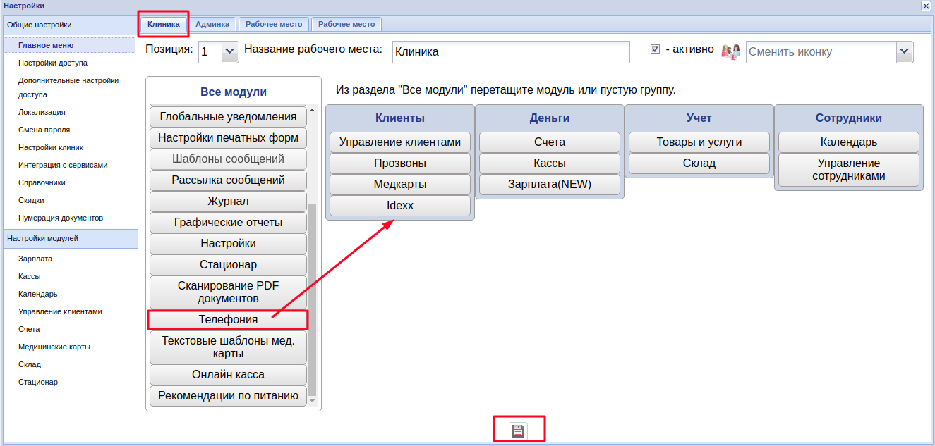 Перейдите в Настройки — Главное меню и перенесите (выделив и зажав левой кнопкой мыши) модуль Телефония в необходимую группу. Сохраните настройку.