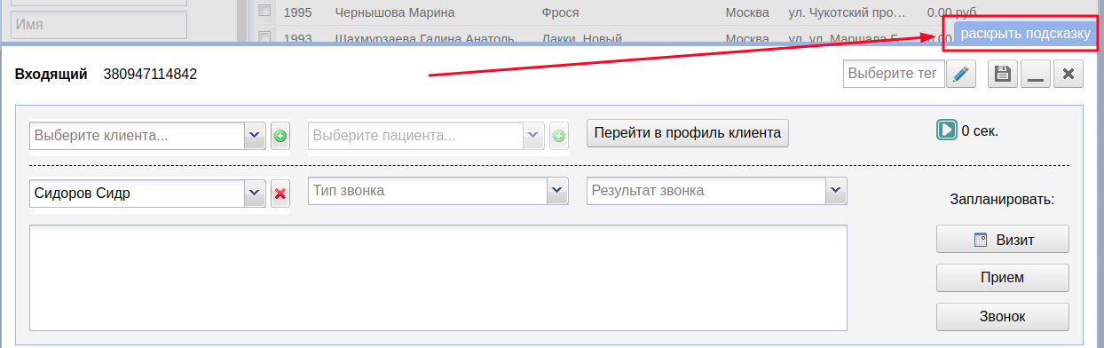Откроется окно редактирования звонка. Если оператору необходимо озвучивать текст приветствия или задавать перечень необходимых вопросов клиенту — то нужно нажать на вкладку раскрыть подсказку