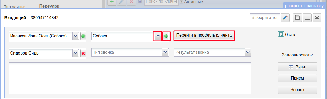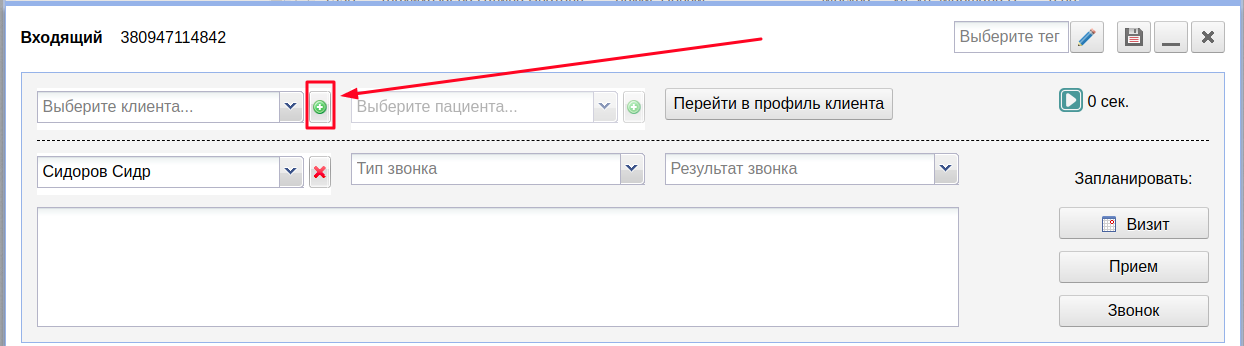 Если звонящий номер уже есть в базе, то рядом с номером будет отображаться ФИО клиента. Если номер новый, то вы можете создать нового клиента, нажав на кнопку добавления рядом с полем клиента. Откроется стандартное окно добавления нового клиента.
