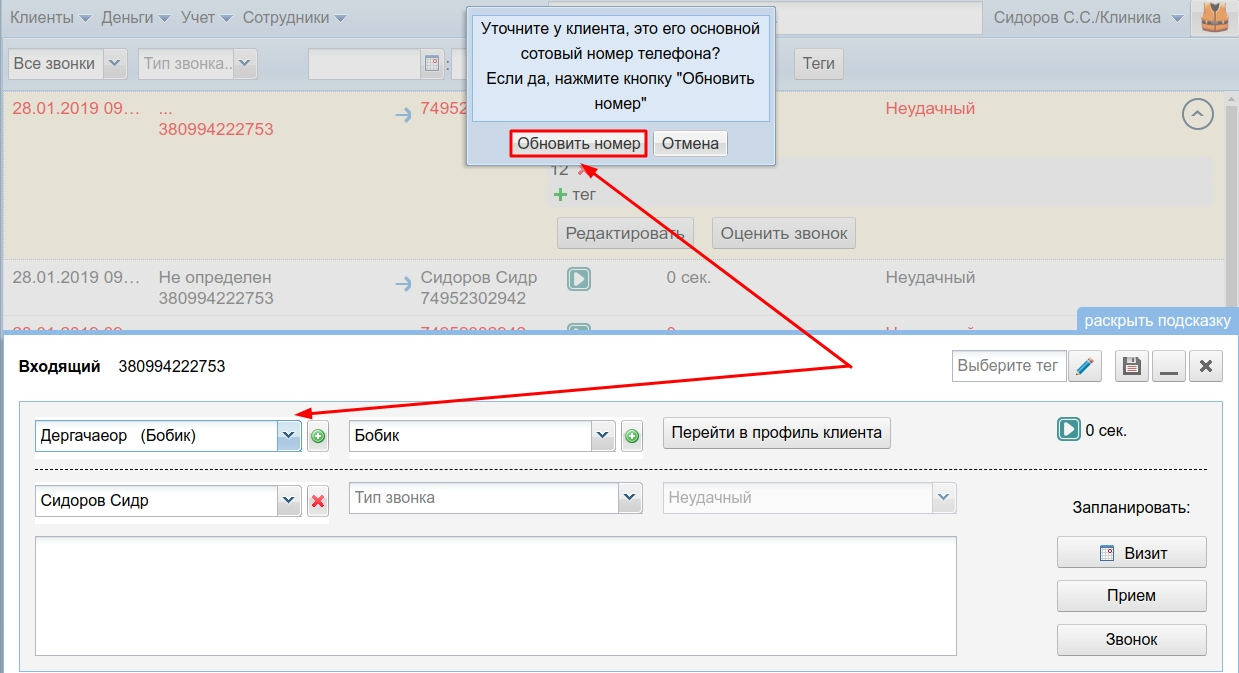 Если клиент звонит с другого/нового номера телефона, не внесенного в базу, тогда можно изменить старый (неиспользуемый) номер телефона на текущий. Для этого найдите необходимого клиента в выпадающем списке и в появившемся окне сообщения нажмите на кнопку Обновить номер. Если нет необходимости изменять телефон, тогда нажмите на кнопку Отмена