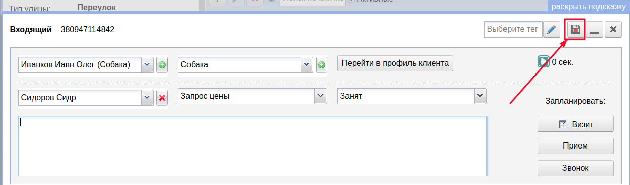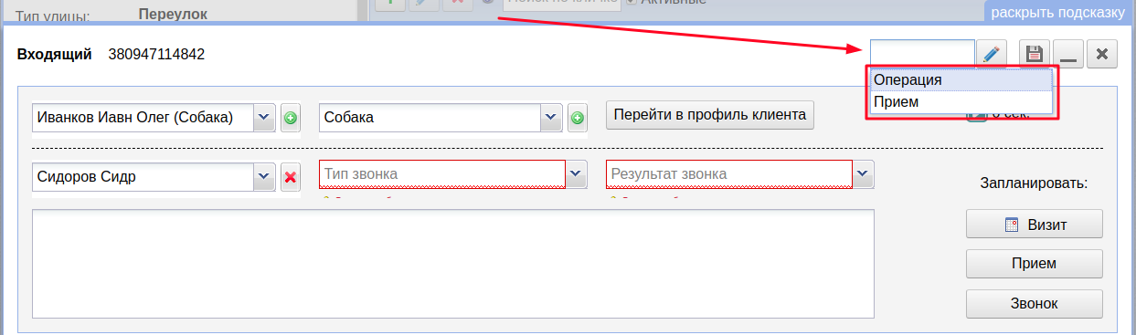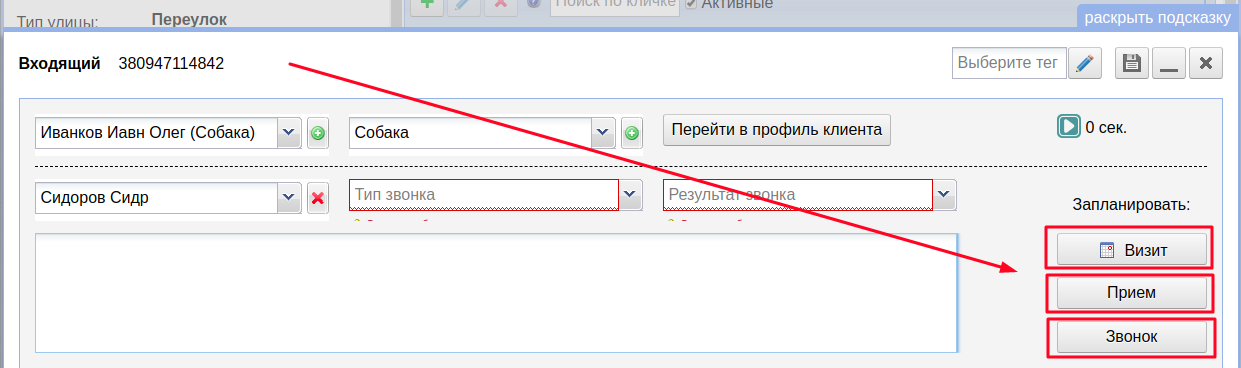 В момент разговора можно запланировать визит, направить на прием или запланировать звонок. Для этого нажмите на необходимую кнопку и откроется соответствующая форма.