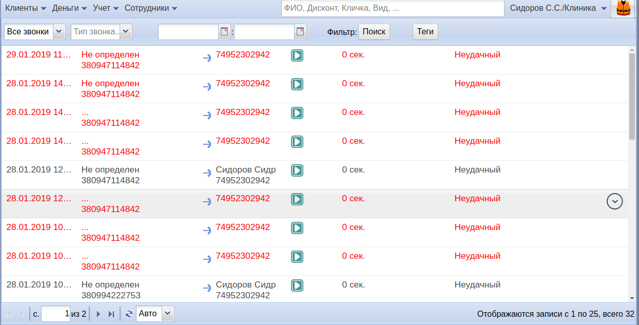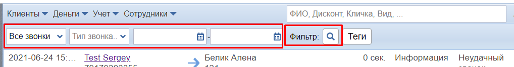 В верхнем фильтре можно фильтровать записи по виду, типу и дате звонка.