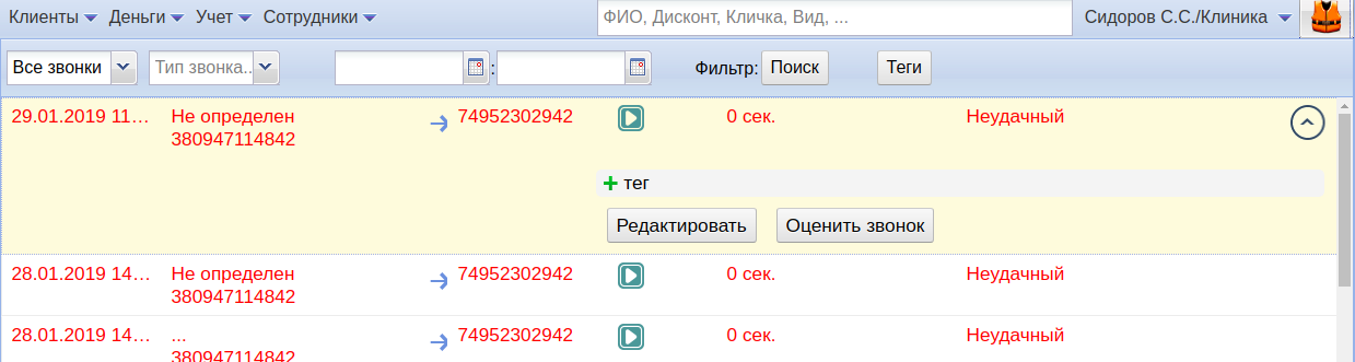 Если нужно найти запись звонка по номеру телефона или комментарию звонка, тогда нажмите кнопку Поиск, введите значение в необходимое поле и нажмите на кнопку Применить. Для поиска записи по тегам нажмите на кнопку Теги и выберите необходимый тег.