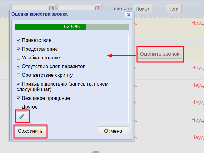 В окне оценки звонка проставляются галочками пункты, которые были выполнены во время звонка. При проставлении галочек будет заполняться шкала выполненных условий.