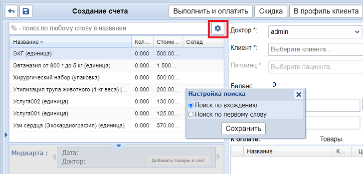 Для добавления в счет товара/услуги в поле Поиск введите его название или часть. Поиск может работать либо по первому слову, либо по любому слову из названия. Чтобы настроить удобный для себя вариант, в поле поиска нажмите шестеренку и выставьте значение и сохраните.