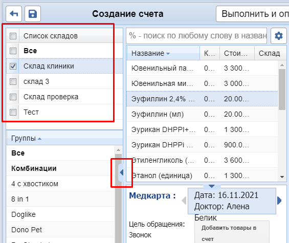 При добавлении комбинации в счет товар спишется с тех складов, на которых находится товар Комбинации, независимо от того, какой склад выбран в фильтре.