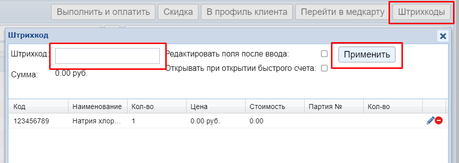 Необходимо провести сканером по товару, в поле Штрихкод отобразится его код, а чуть ниже в таблице появится информация о нем (если этот товар заведен в модуле Товары и услуги и у него прописан штрихкод).