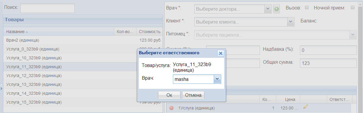 При выборе услуги в счет (если именно на эту услугу назначены определенные ответственные) программа выдает сообщение о том что нужно выбрать ответственного из предлагаемого списка. Первыми в списке будут отображаться работники, которые на данный момент в смене (назначается рабочий график в модуле Календарь).