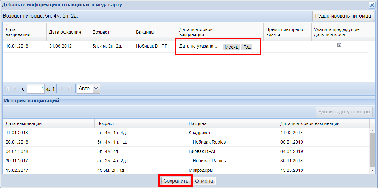 При добавлении в счет вакцины программа автоматически предложит добавить запись о вакцинации в медкарту и назначить дату следующей вакцинации.