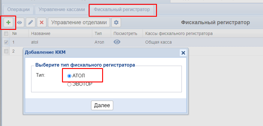 Нажать кнопку Добавить (зеленый +) и выбрать из списка доступных ККМ: АТОЛ, нажать кнопку Далее.