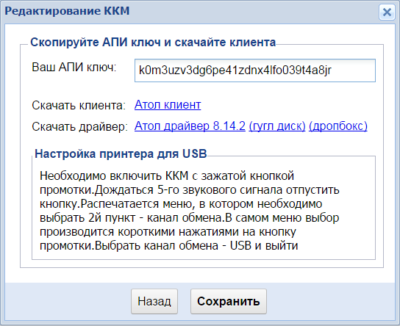 5. Скопировать АПИ ключ, скачать Атол клиент и Атол драйвер. Нажать кнопку Сохранить.