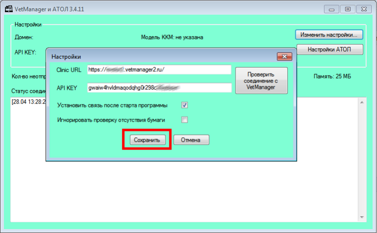 После сохранения нажмите кнопку Проверить соединение с Vetmanager. Должно появиться сообщение об успешном соединении.