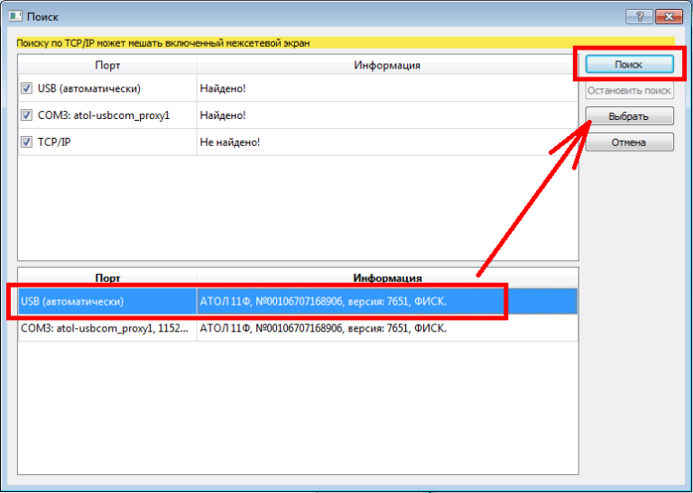 В новом окне снова нажать кнопку Поиск,  выбрать из списка подключенный фискальный аппарат (Порт USB) и нажать Выбрать.