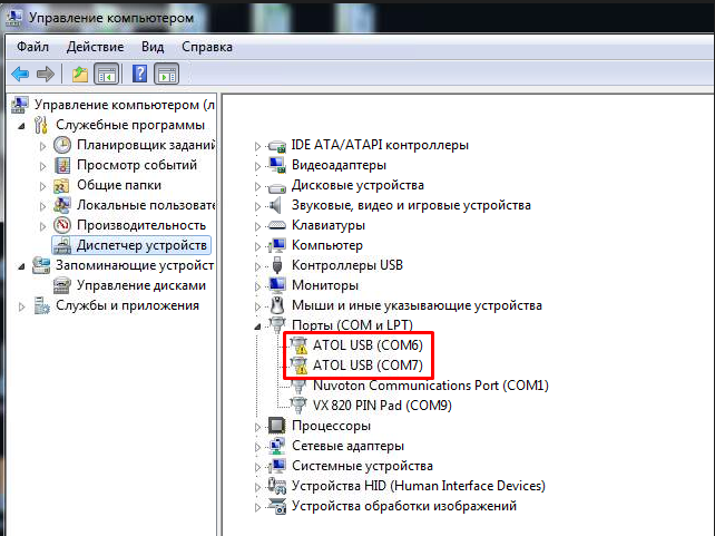 - Зайти в Диспетчер устройств на компьютере и проверить, есть ли порты Атола.
