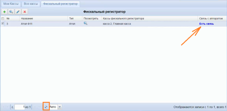 В программе во вкладке Фискальный регистратор нажмите кнопку Обновить (внизу страницы) — в информации Связь с аппаратом изменится статус. Если все настроено верно, там будет написано Есть связь.