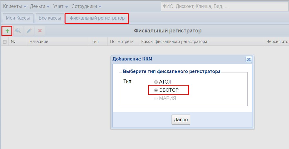 Чтобы добавить фискальный регистратор Эвотор, нужно перейти в Деньги — Кассы — вкладка Фискальный регистратор. Нажать зеленый плюс. В открывшемся окне выбрать Эвотор, нажать Далее
