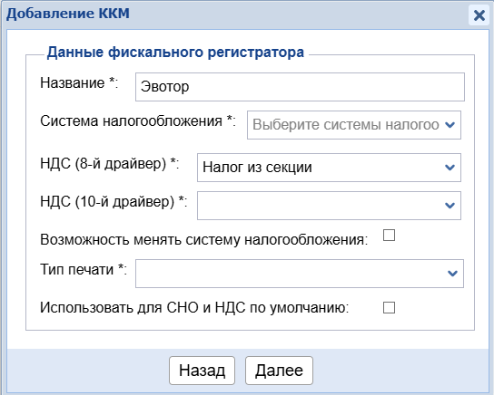 После этого нужно ввести название и выбрать систему налогообложения такую, которая была введена при первой настройке Эвотор.