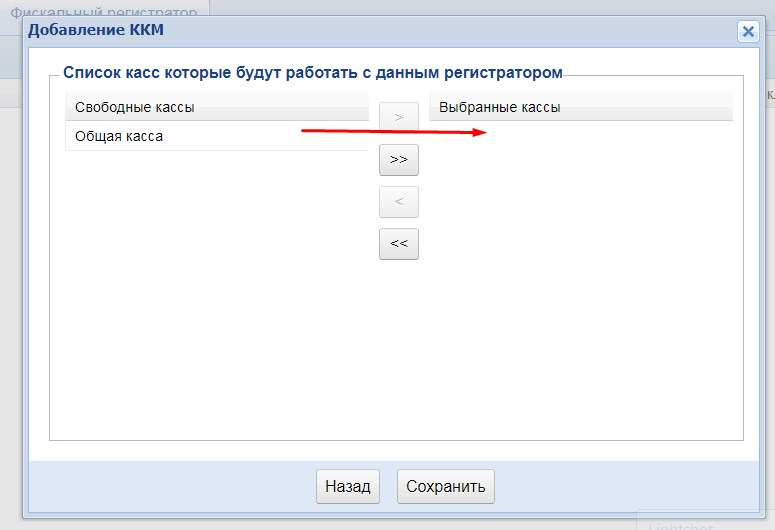 На следующем шаге нужно добавить кассы, которые будут работать с данным фискальным регистратором. Нажать Сохранить.