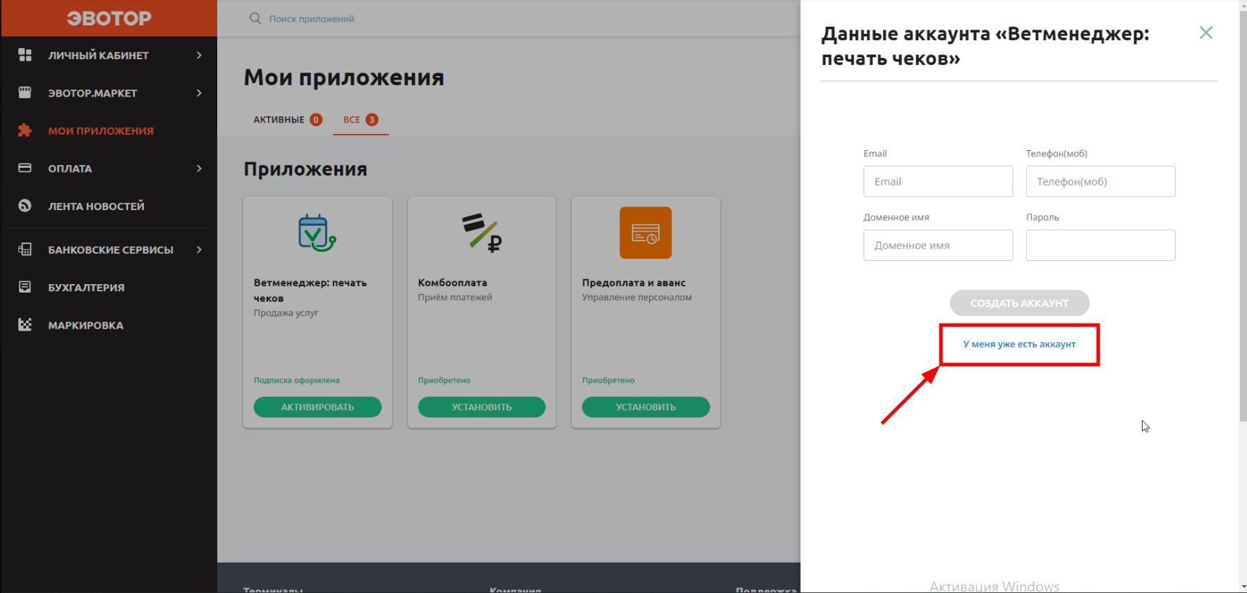 Далее, если вы уже зарегистрированы в программе "Ветменеджер" вам нужно нажать "У меня уже есть аккаунт"