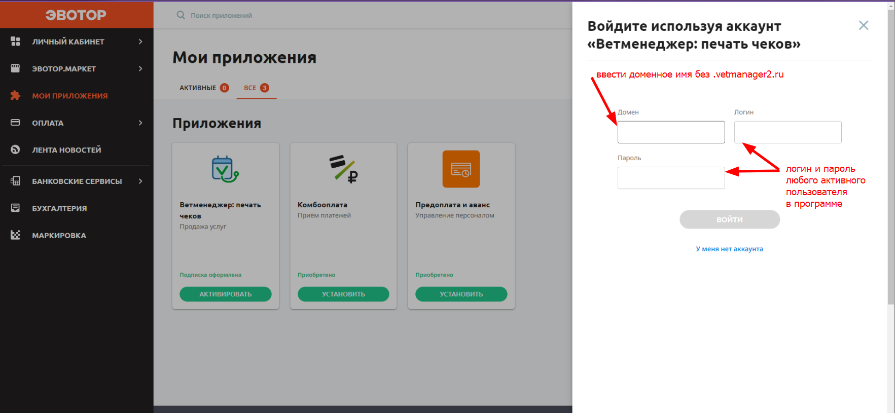 При первом запуске приложения нужно ввести домен, логин и пароль пользователя, ответственного за кассу в Ветменеджер.