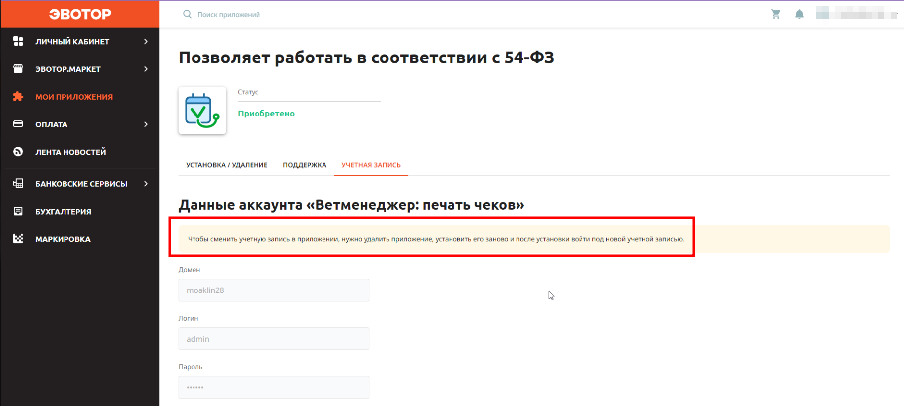 Нужно зайти в личный кабинет Эвотор и в магазине приложений найти и установить приложение Ветменеджер: печать чеков. Приложение платное (тарифы формируются согласно политики Эвотор).