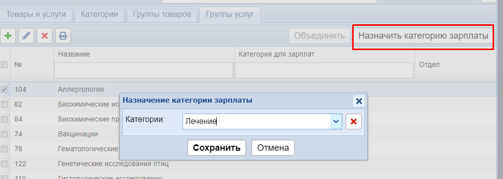 Нам нужно назначить категории на все группы товаров/услуг, за продажу которых мы будем платить зарплату. Для этого переходим в Товары и услуги — вкладка Группы товаров или Группы услуг — выделяем нужную нам группу и жмем кнопку Назначить категорию.