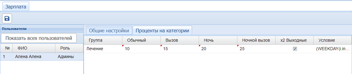 Переходим в Настройки — Зарплата — в колонке Пользователи выбираем сотрудника и открываем вкладку Процент на категории товаров. Здесь нужно проставить проценты, которые сотрудник должен получить в зарплату за разные категории.