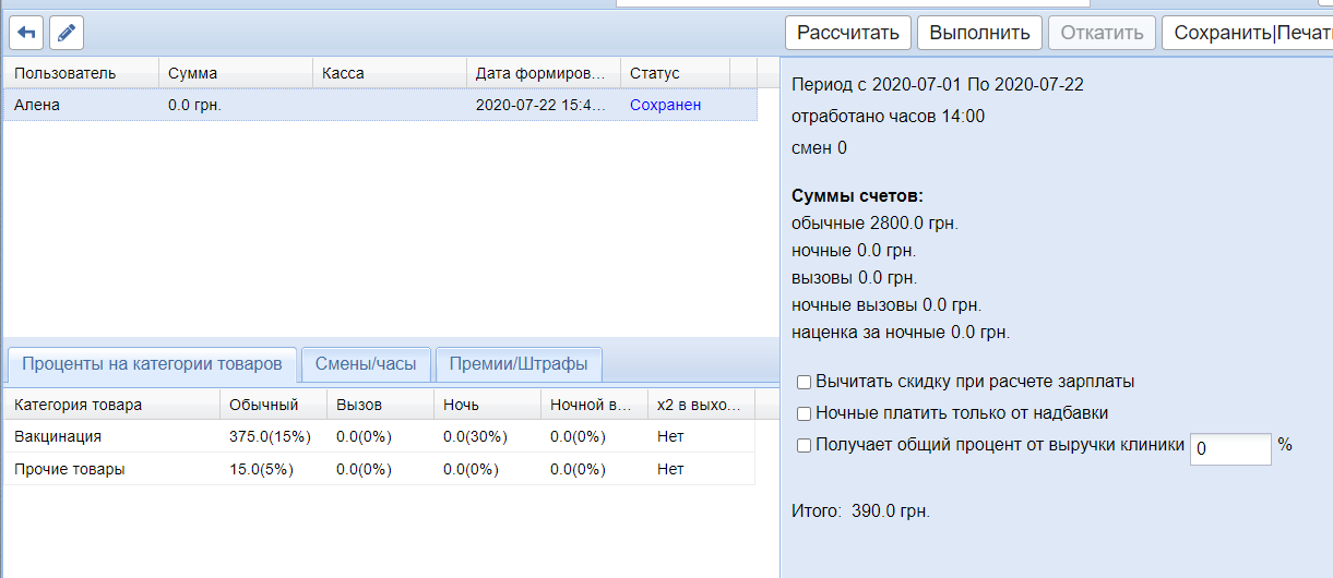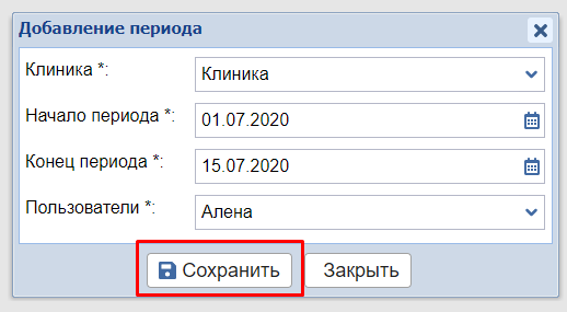 В открывшемся окошке выбираем клинику, начало и конец периода, пользователей (можно создавать документы зарплаты на каждого сотрудника отдельно либо на нескольких сразу). Жмем Сохранить.