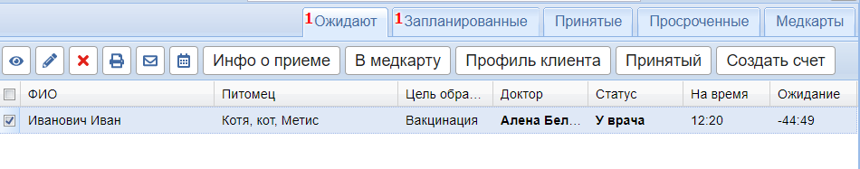 Такой клиент попадает во вкладку Ожидают. Это означает, что он уже в клинике, находится в очереди.