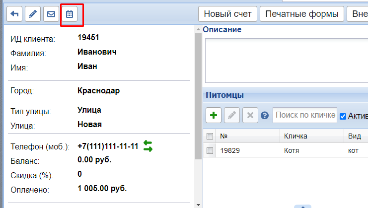 Визит можно запланировать через кнопку планирования в виде календарика (см. картинку). Эта кнопка есть в модуле Управление клиентами, в профиле клиента, в медкарте.