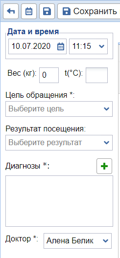 • Доктор — обязательное для заполнения поля. Если оно пустое, необходимо сделать настройку автозаполнения.