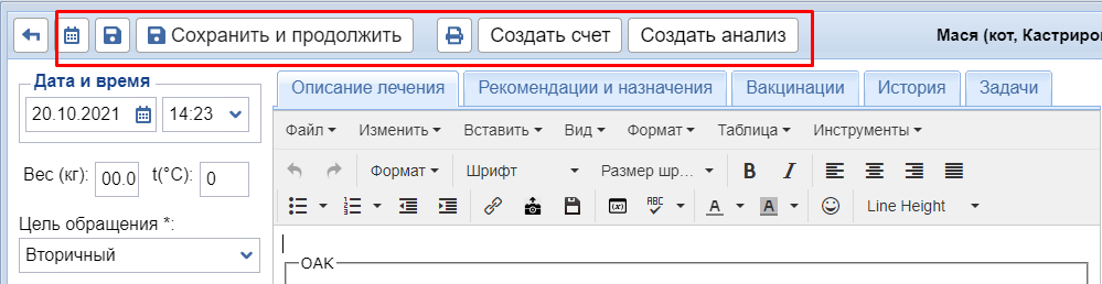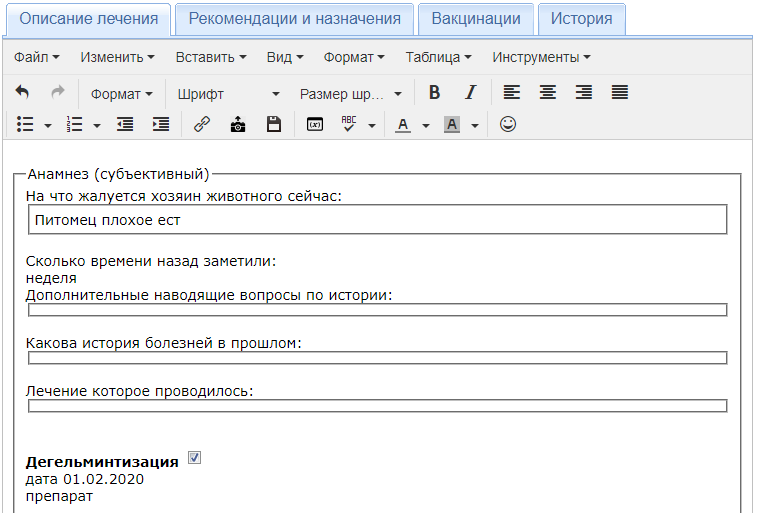 Описание лечения в Ветменеджере