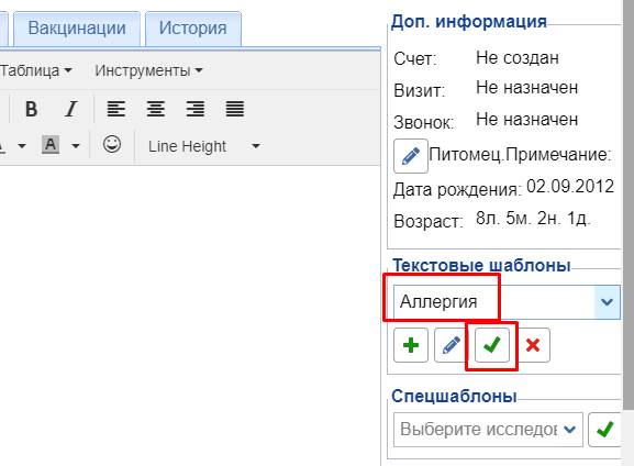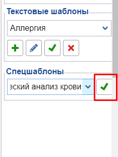 • Галочка — добавление шаблона в текущую медкарту.