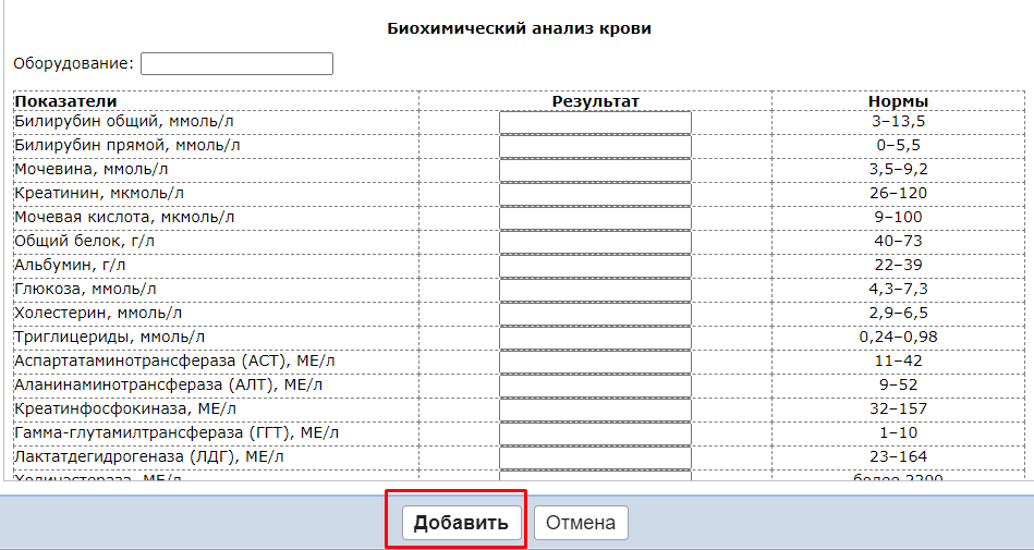 Откроется окно добавления исследования. В него нужно внести результаты и нажать кнопку Добавить.