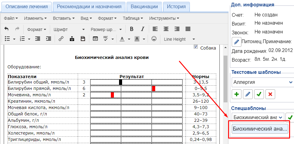 Во вкладке Описание лечения можно вносить анамнез, лечение или анализы, которые проводились. Можно использовать текстовые шаблоны, для внесения результатов анализов — спецшаблоны.