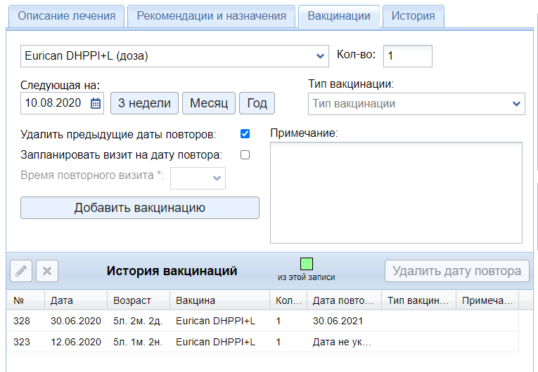• Удалить предыдущие даты повторов — если поставить здесь галочку, то запланированные даты повтора данной вакцинации будут удалены.  Это позволяет, например, не отсылать ошибочно напоминание клиенту о приближающейся повторной вакцинации, если пациенту уже её провели.