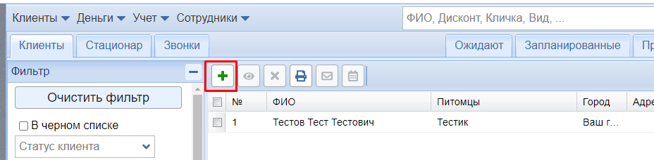 Чтобы добавить нового клиента, нужно в модуле Клиенты нажать зеленый плюс и заполнить все необходимые поля (* отмечено обязательное заполнение).