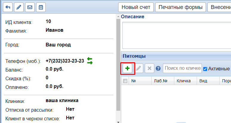 После сохранения программа перейдет в профиль клиента. Там нужно добавить Питомца (через зеленый плюс)