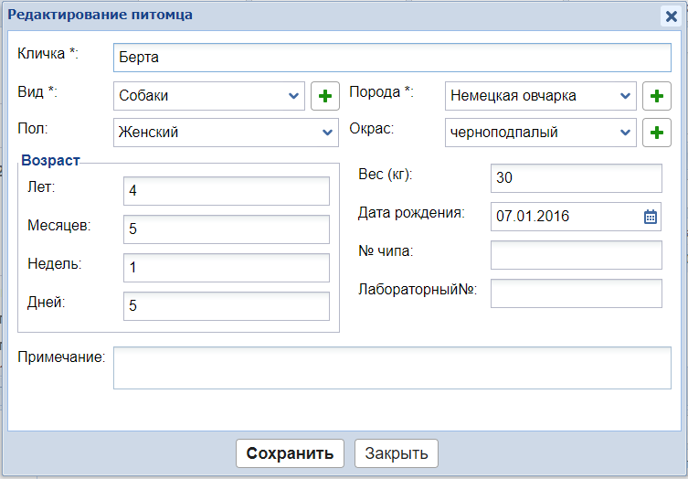 • Примечание — заполняется любой информацией (например, если у животного аллергия, это можно внести в примечание).