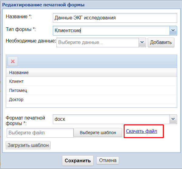 Когда все изменения внесены, нужно загрузить файл в печатные формы. Для этого нужно открыть форму на редактирование и нажать кнопку Выберите шаблон.