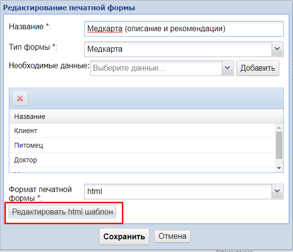 Чтобы отредактировать форму html, нужно выбрать форму, нажать карандаш и кнопку Редактировать html-шаблон