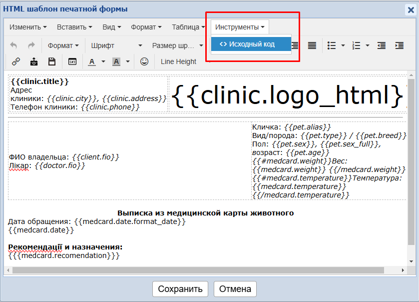 Важно! Переменная {{clinic.logo_html}} - не работает для docx. Логотип вставляется в Word.
