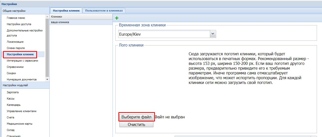 Переходите в Настройки — Настройки клиник — в разделе Лого клиники нажмите Выберите файл и добавьте ваш логотип с ПК.
