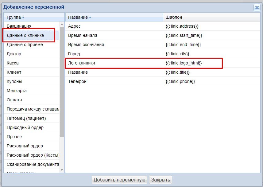 Для этого кликаем по кнопке Вставить переменную — открываем раздел Данные о клинике — находим переменную Лого клиники и жмем Добавить.