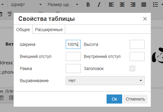 Для этого жмем Таблица — выбираем количество столбцов и строк. Потом в свойствах таблицы ставим ширина 100% и поле Рамка оставляем пустым, чтобы рамки не было видно при печати.