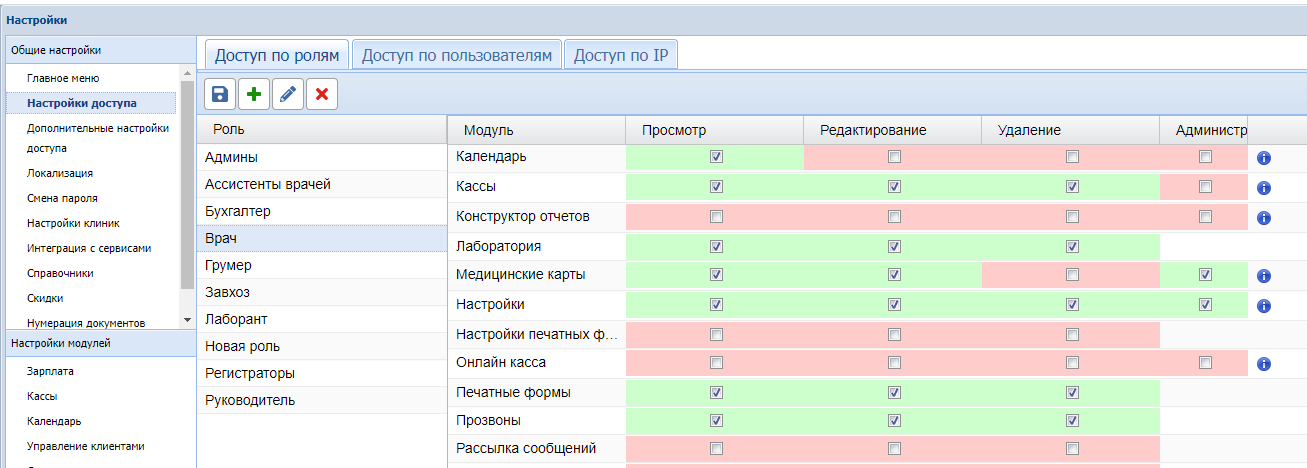 В настройках можно разрешить или забрать доступ к разным модулям программы. Это можно сделать как по ролям, так и персонально каждому пользователю.