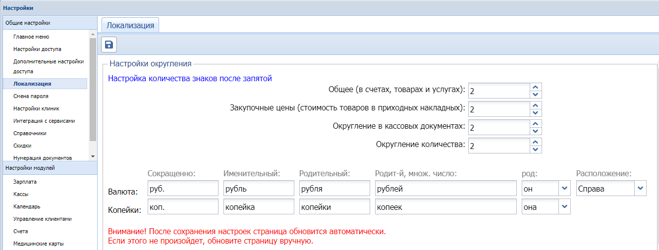 Например, если вы не хотите, чтобы счета выставлялись с копейками, в настройке количества знаков в строке Общее поставьте 0.
