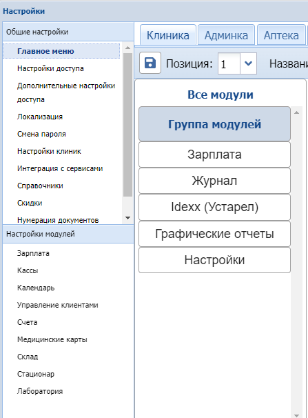 Здесь можно настроить зарплату, доступ на оплату в кассы, сделать настройку медицинских карт, счетов и склада.
