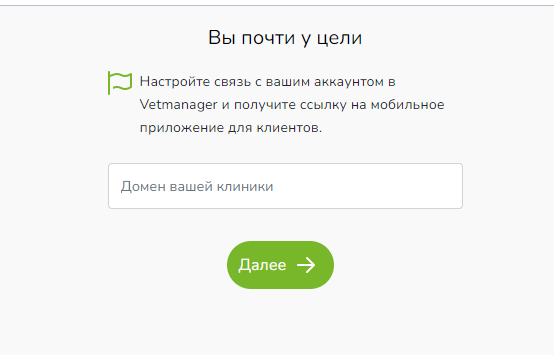 Далее необходимо настроить связь с вашим аккаунтом в Ветменеджере. Для этого на следующем шаге введите домен вашей клиники (домен можно посмотреть в адресной строке браузера при входе в программу —  это будет уникальное слово перед vetmanager.ru)